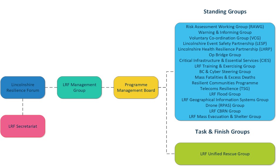 LRF partners share responsibility to continually develop Lincolnshire’s resilience in the face of large-scale emergency situations, with guidance and support from lead government departments and agencies, local authorities, emergency services, health, utilities providers, communication providers and transport companies.